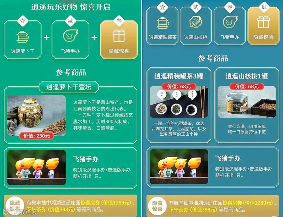 旅游超级品牌日”活动按照“一天四时”理念,将杭州文旅特色以“清晨——经典杭州”“午后——风雅杭州”“傍晚——妩媚杭州”“夜间——活力杭州”为主题进行“杭州城市盲盒”打造。整款盲盒包含联名限量手办、茶叶、张小泉剪刀等杭州特色产品及酒店房券、下午茶券、SPA券等,充满了杭州特色,拓展了盲盒新玩法。