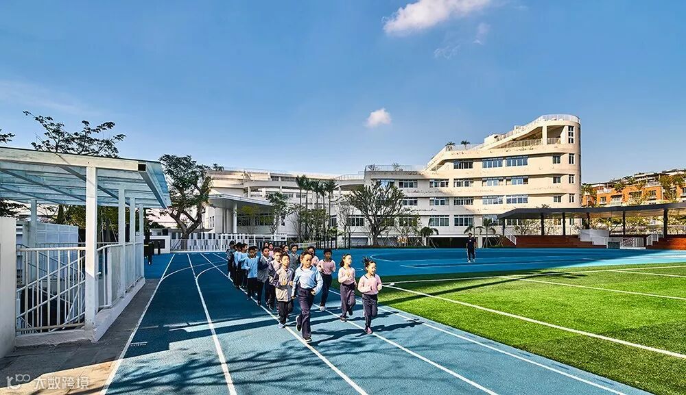 在深圳市库坑中学项目中,筑博设计提出“时段性社区共享”的概念——学校可在放学后和寒暑假等时间段对社区开放跑道,运动场,体育馆,游泳馆食堂和礼堂等功能,减少此类功能空间的空置率。将学校的物理边界分时段打开后,将最大化利用复合空间服务于整个社区,使得原来封闭的校园成为一个充满活力的场所。