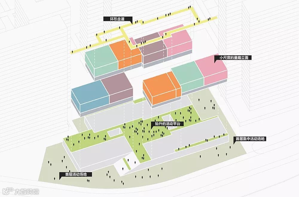 佛山保利和光花园幼儿园在最大化利用南向景观资源的基础上,通过抬升的活动平台、小尺度的童趣立面、连通的环形走道给孩子们提供多重活动空间,创造出一个“浮动的童趣乐园”。