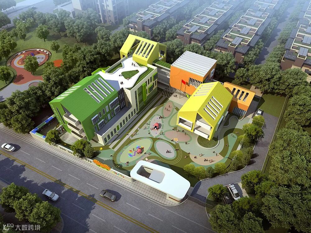 建筑以独特的造型打破了传统教育建筑,教学楼呈环形布置,体现出学校完善的整体感。在学校内部的布置上、营造出丰富的情感,给予孩子们丰富的视觉感与合适的交流场所。通过设计后的建筑空间每一处都是学习场所,满足孩子随时随地学习的需要。