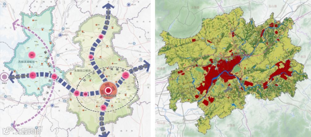 上饶中心城区,在撤县扩区之前,是信江、丰溪河交汇处发展的信州区小城格局。进入改革开发以来,城市的各类产业和开发区实际上是在小主城的春江大道一路之隔、西边的上饶县域的信江北岸下游地区铺开的。沿江而下、跨江向南,引入产业和开发地产,成为上饶的共同策略;也是县市体制两者之间没有理顺之前,所有类似的紧邻中心城区行政边界之外、城市空间失序的普遍现象: