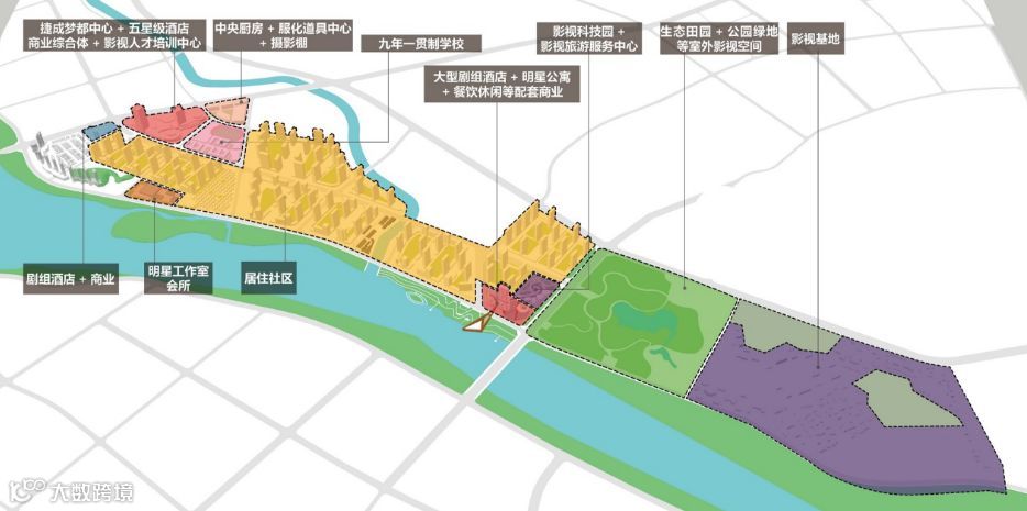 通过青春魅力的街道场景,影视娱乐主题的商业街区,完善的公共服务配套设施,建设如梦如幻的山水梦境影视城;通过向水而生的步行绿廊,多层次的组团空间,实现健康活力的水岸生活,热闹的滨水社区商业。打造出集影视产业、文化景区、旅游服务和智慧生活四大功能为一体的影视科技文化特色新区,建设世界一流、国内领先的影视文旅示范产业园区。