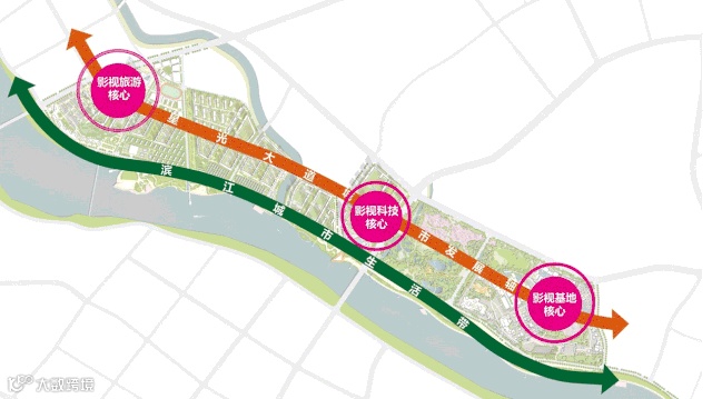 规划设计从三个要点出发:为城创造影视文旅产业全国示范项目的崭新城市名片、为游客提供特色影视主题的创新型旅游目的地、为片区市民营造产城融合的兴业宜居的新兴魅力小镇。空间结构以“一轴一带三核心”为主导:一轴代表星光大道城市发展轴;一带代表滨江城市生活带;三核心代表影视旅游核心、影视科技核心、影视基地核心。