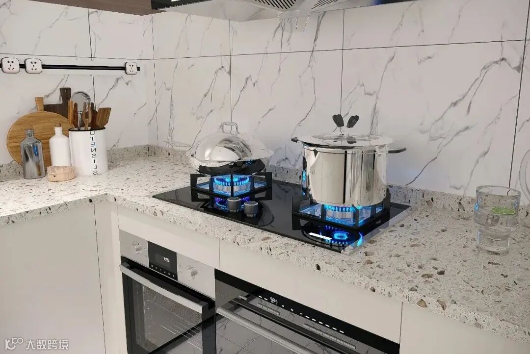 在厨房功能上,为了增加一体化烹饪体验需求,20mm冬叶石英石台面,硬度高耐脏耐高温,烟灶、蒸烤箱、消毒柜嵌入柜类,呈现厨房空间干净利落,不显脏乱拥挤。