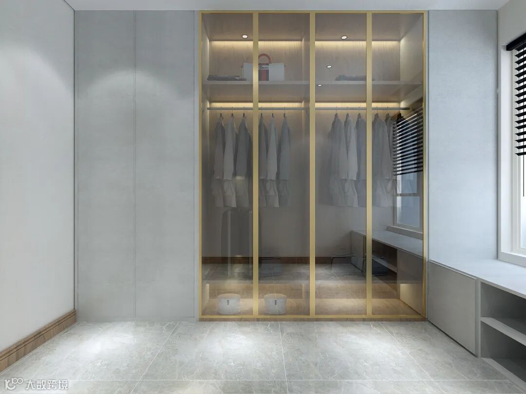 选用玻璃门板衣柜内嵌灯带,每当打开衣柜门时柜内的灯光就会特别的明亮,方便寻找衣物。