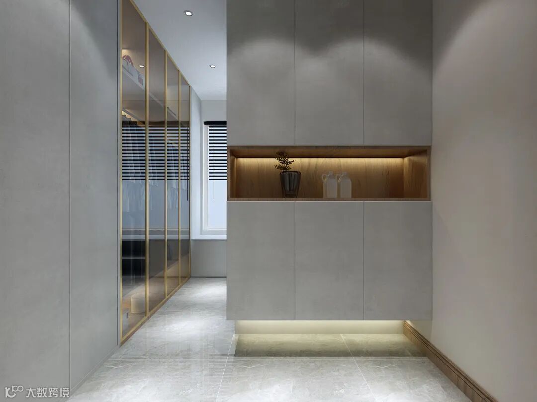 拿出整体的一间房做衣帽间,玄关鞋柜底部留空,中间留空位置放置包包、钥匙、相册等一些装饰用品。