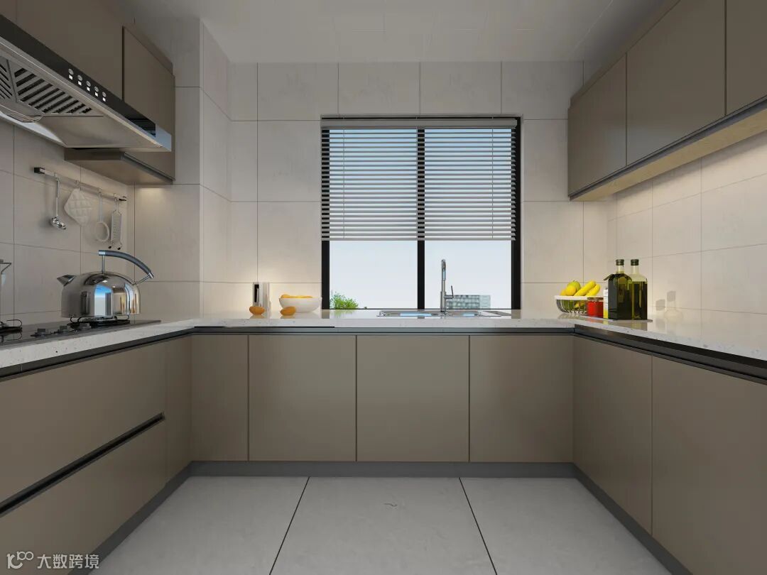 厨房空间比较小,为了增大储物提高收纳,厨房橱柜设计成U型布局。