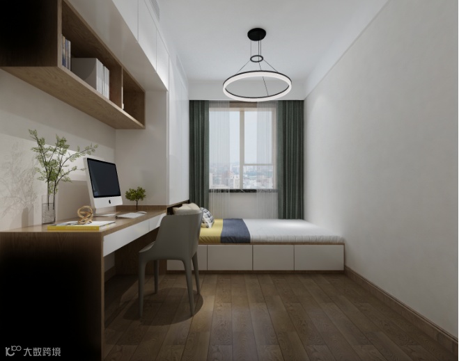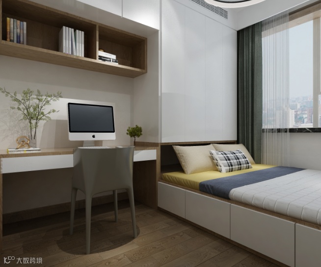 不足5㎡的小卧室,为了能够实现学习、睡觉、储物多功能,考虑了书桌+榻榻米+封顶衣柜的结合设计,榻榻米侧面设计多个抽拉抽屉,这样后期拿取物件比较方便。