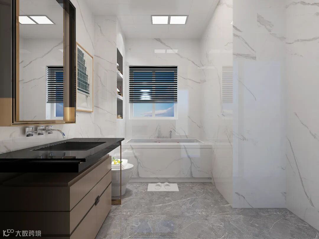 主卫做的装修项目比较多,借用下水管道位置设计出一个壁龛,下面放置浴缸,泡澡时一些洗化用品完全可以放置到壁龛里面,为了方便清洁卫生,马桶考虑墙排,浴室柜台面考虑岩板材质,都是近期 比较流行的设计。