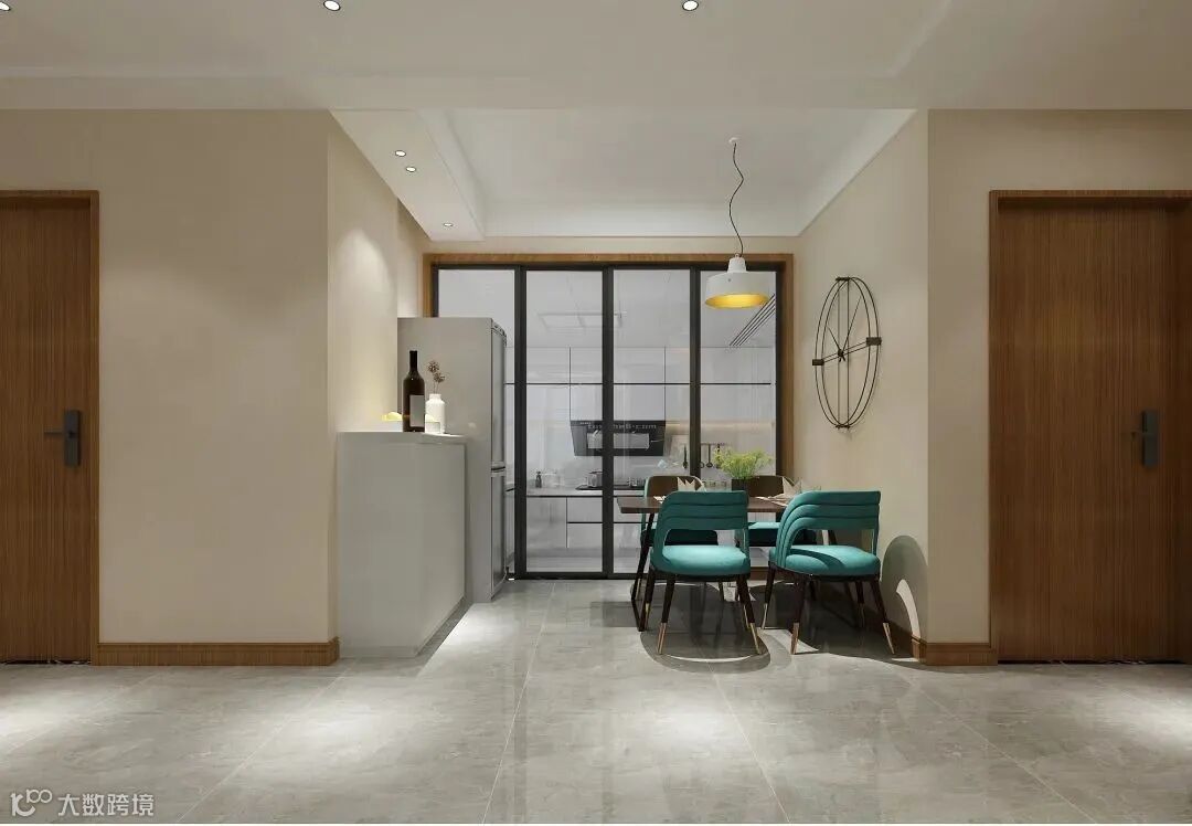 冰箱考虑放置在餐厅位置,为了能够让冰箱与餐边柜保持平齐,餐厅墙内嵌10公分,减少冰箱占用客厅的空间。