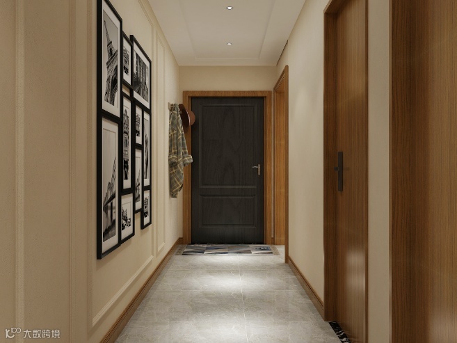 一进门迎来狭长的走廊,设计师在走廊墙面上选择简单的挂画做装饰,墙面选用咖漆色色漆,营造整体走廊的氛围。