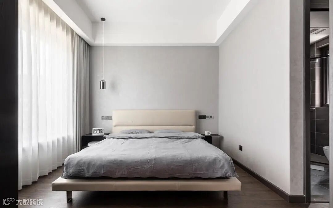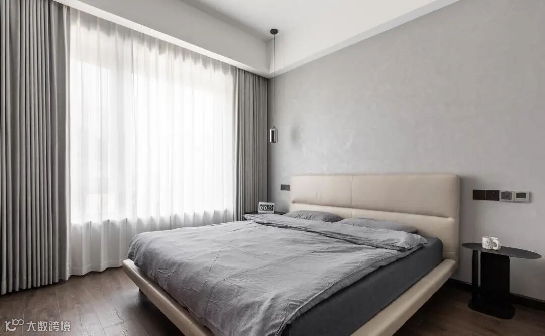 主卧延续客厅同色系,纯色床头背景墙,一盏银色吊灯装饰,同样蔓延着一份温馨与淡然。