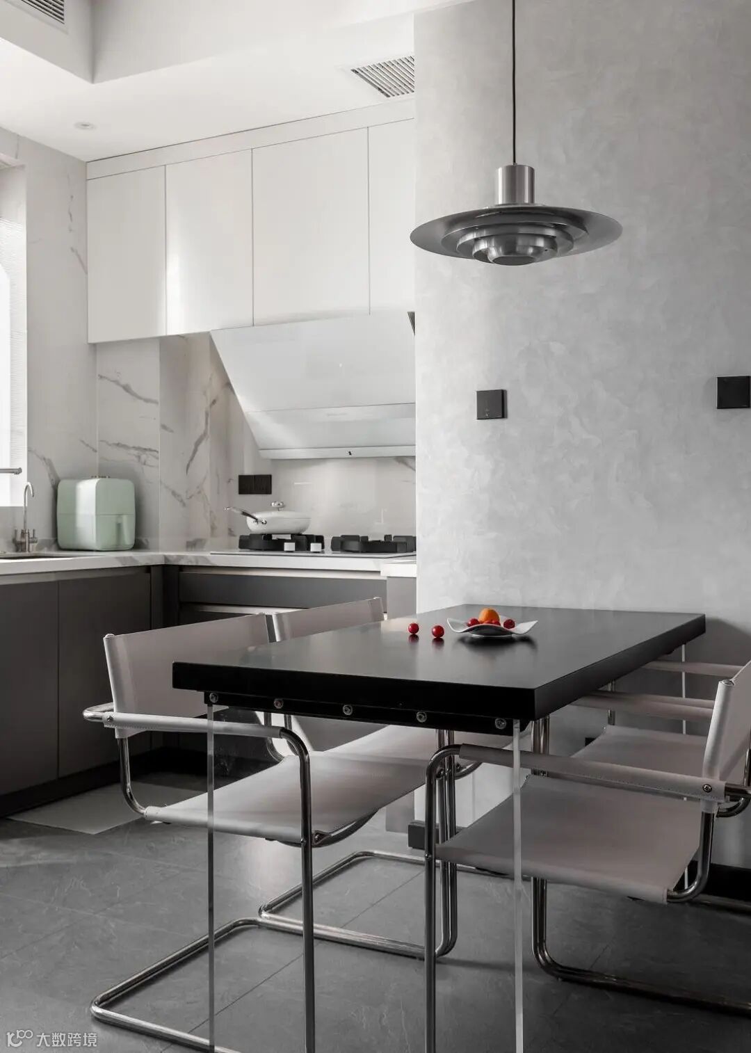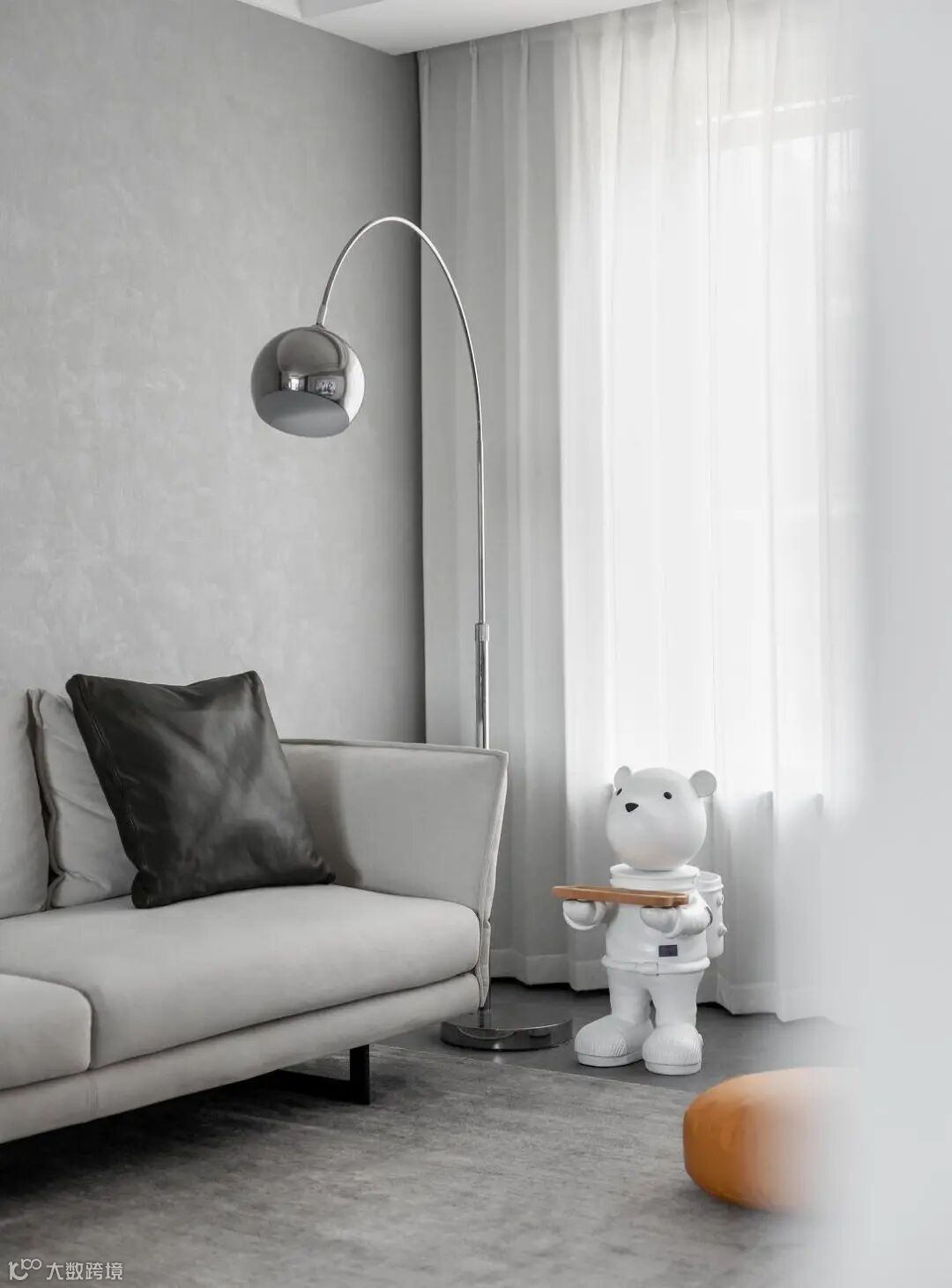 墙面没有过多装饰,延续简约大气的设计基调。钓鱼灯的设置,丰富了空间的金属质感;而玩偶摆件的放置,又中和了黑白灰空间特有的肃穆、沉寂感。不同材质、纹理搭配得当,相互平衡,增加了空间层次感。