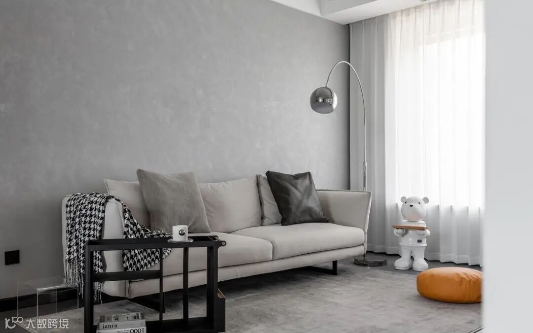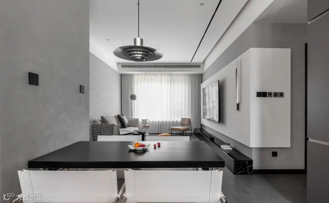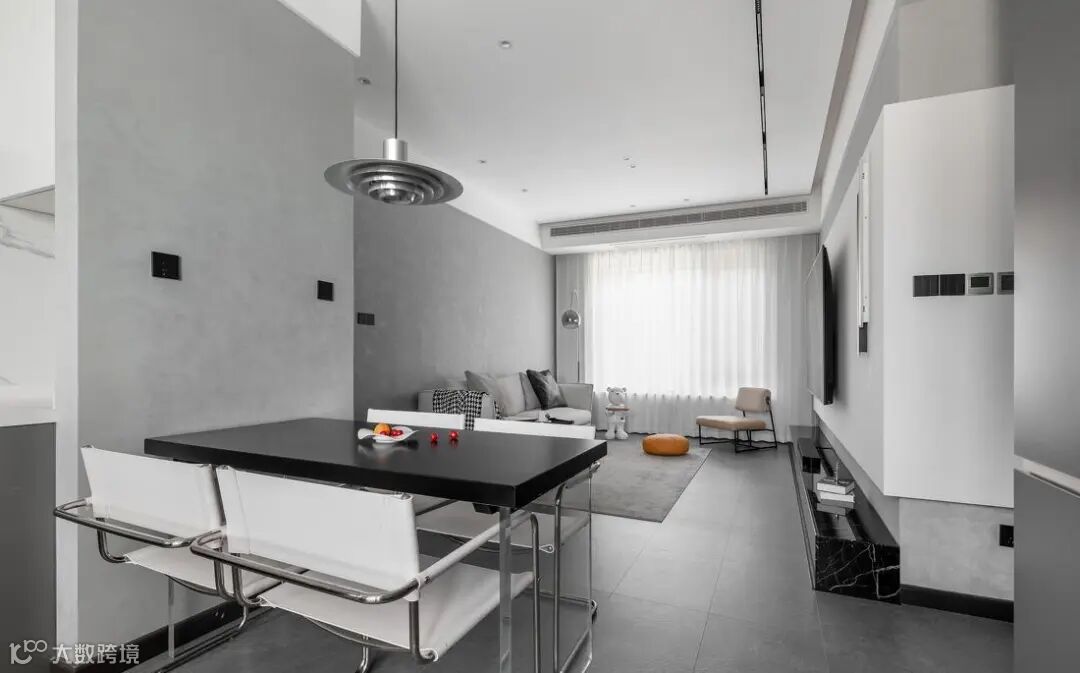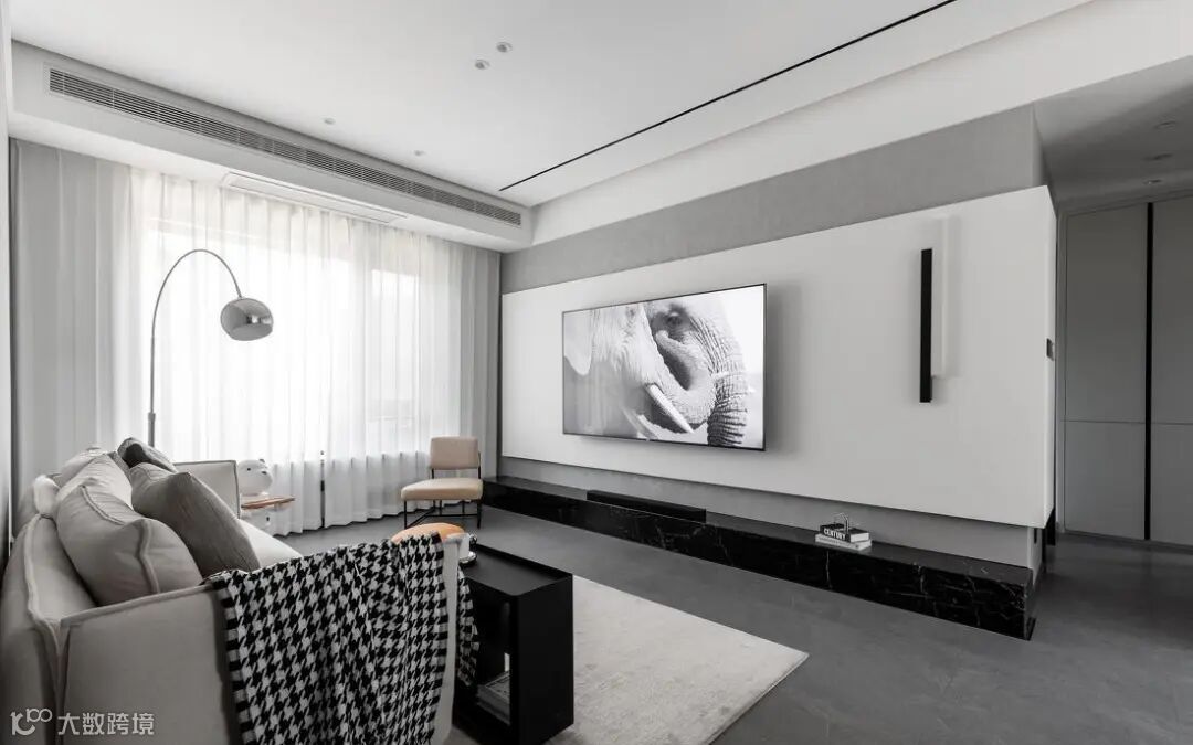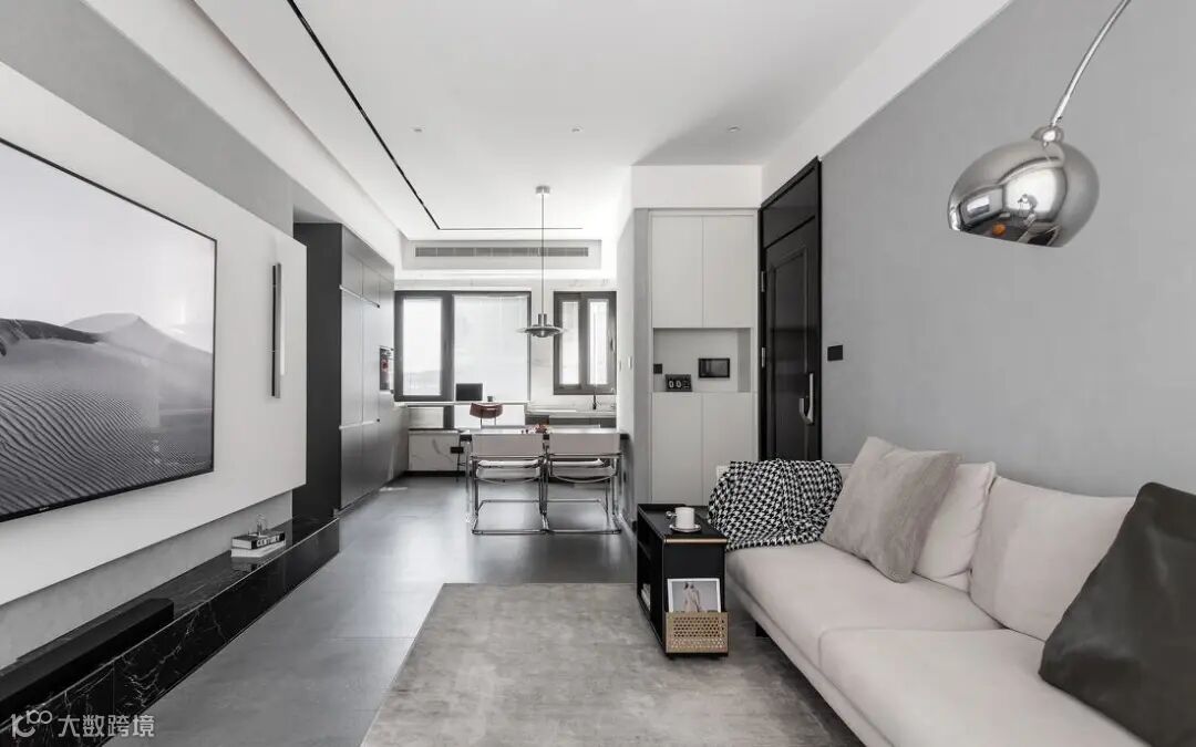客厅整体风格走现代简约风,黑白灰的色彩搭配,干净利落而又高级有质感。