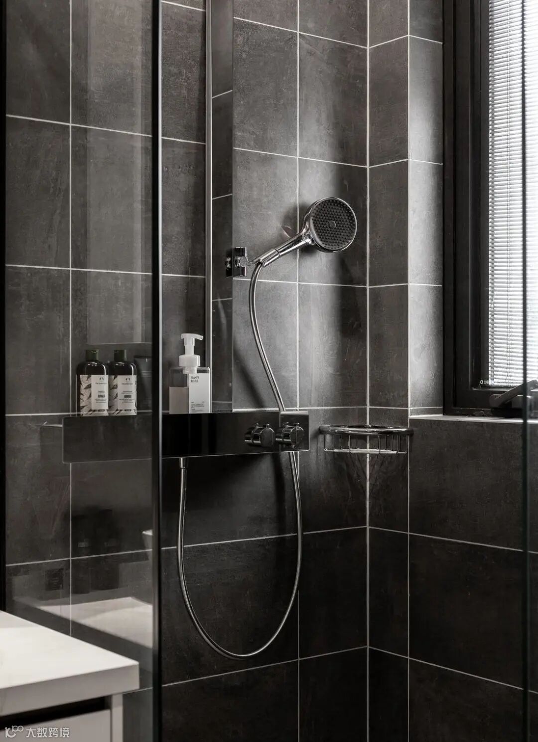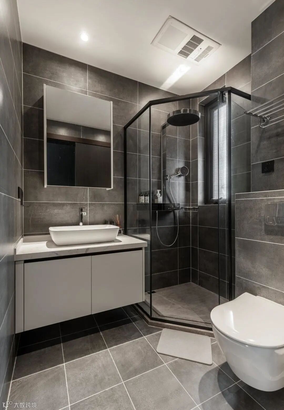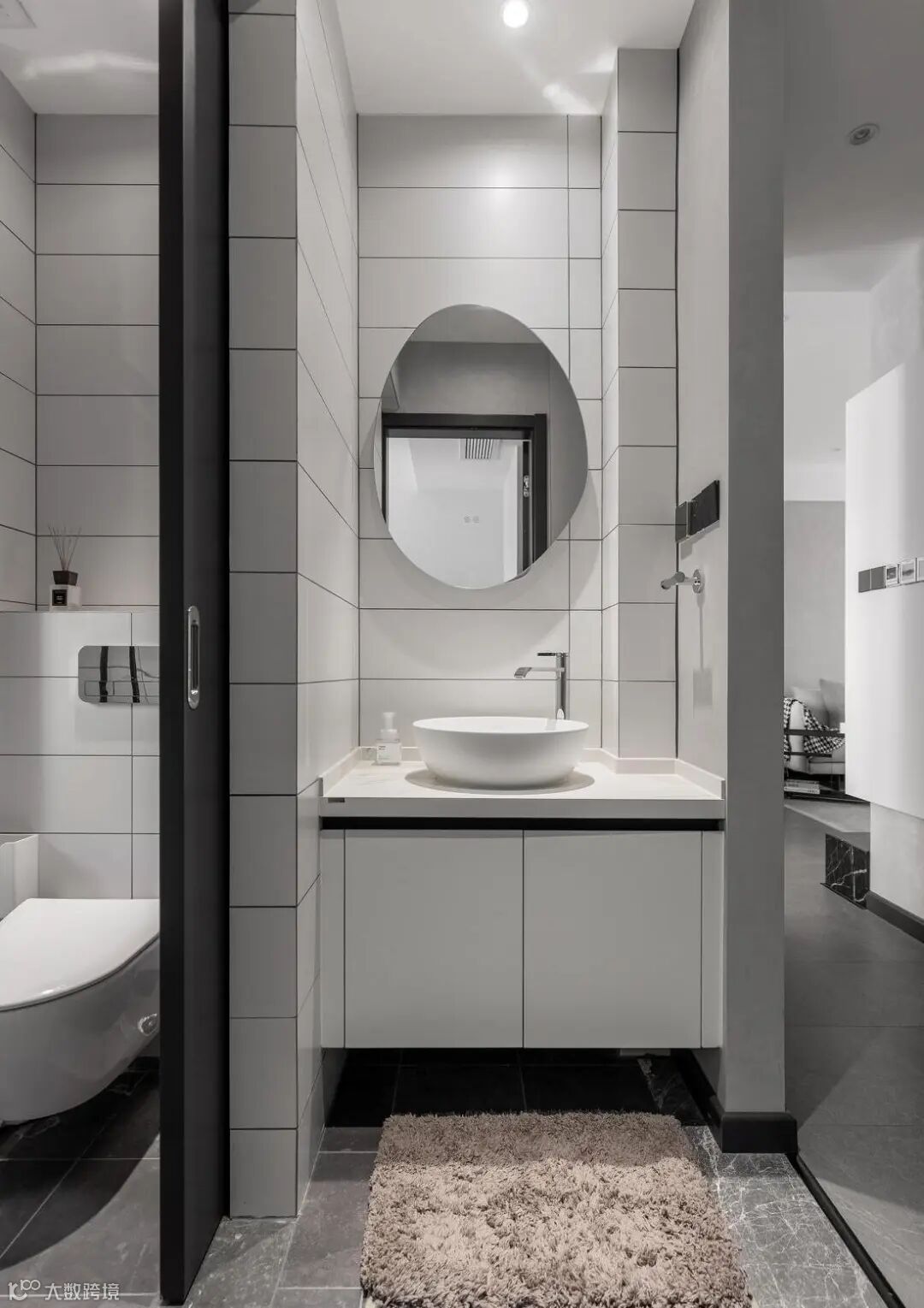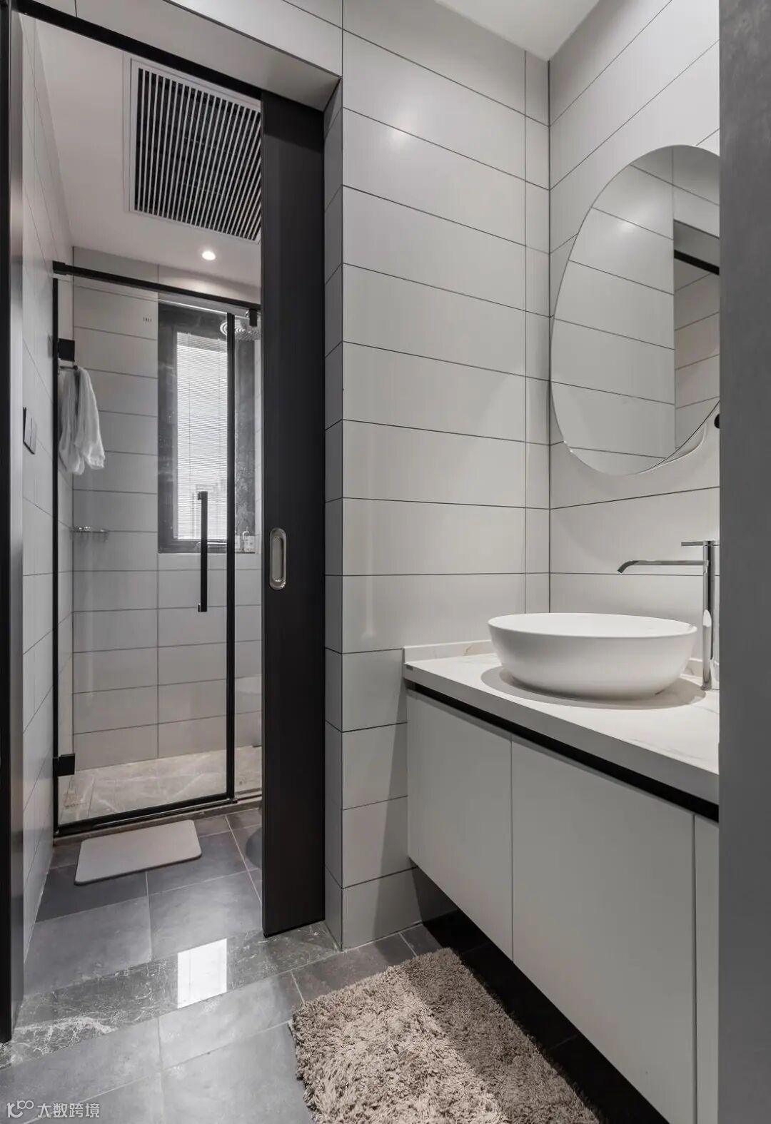 主卫依旧延续整体空间的黑白灰风格,黑色哑光墙砖、灰色哑光地砖,配以纯白浴室柜及银色镜面,色彩搭配恰到好处,精致感十足。