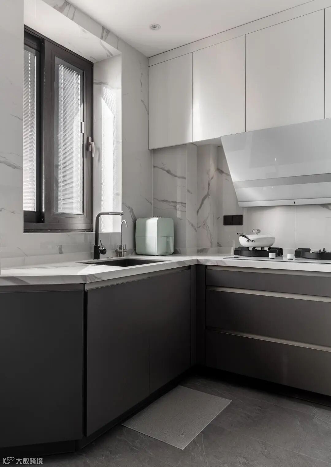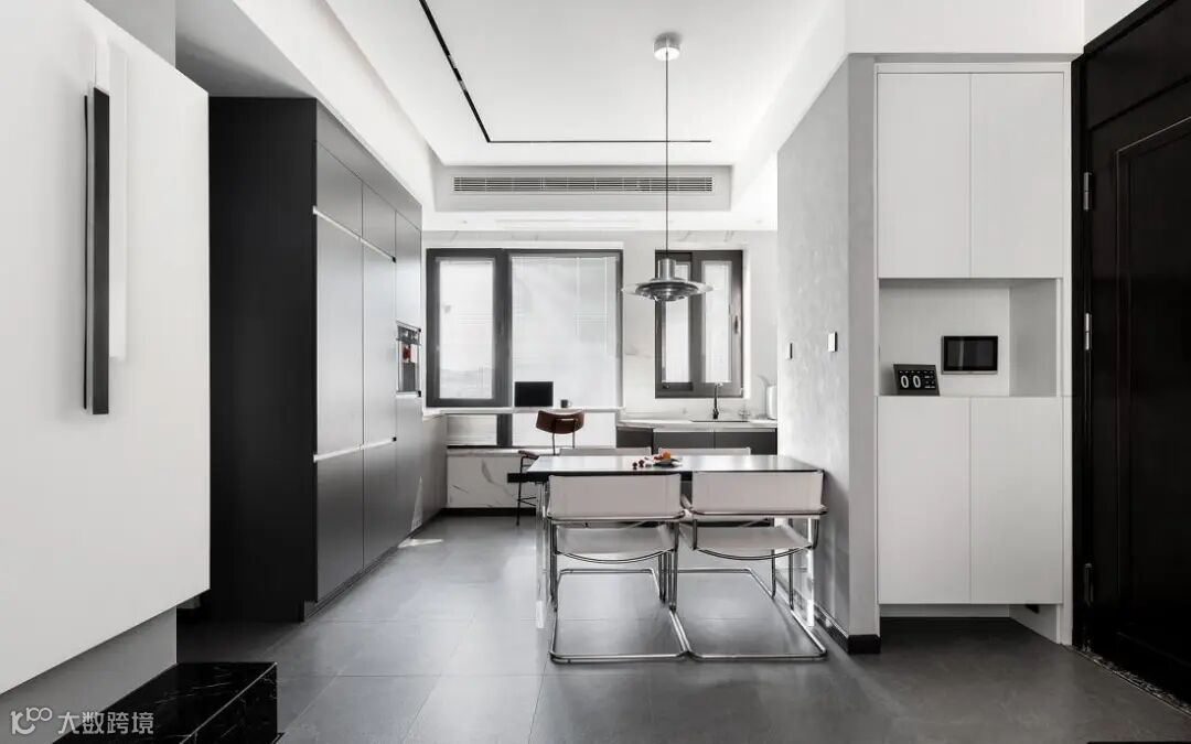 厨房做开放式设计,与餐厅相连,消除原有狭小厨房空间的束缚。客厅通铺的哑光水泥灰地砖一直延伸至餐厨区,空间更加整齐统一,开阔的布局让人顿感舒畅。