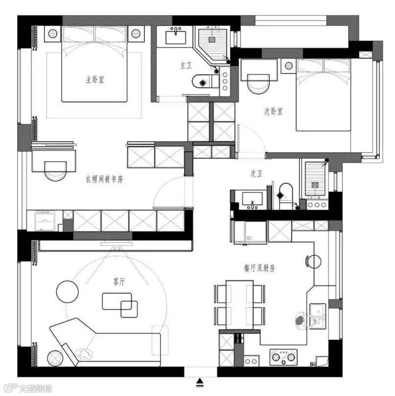 2. 将卧室与次卧间隔墙拆除,将次卧补做衣帽间及办公空间,形成套间式主卧。