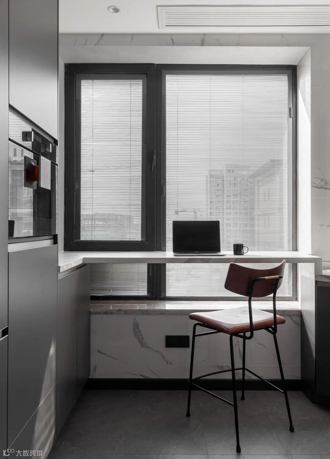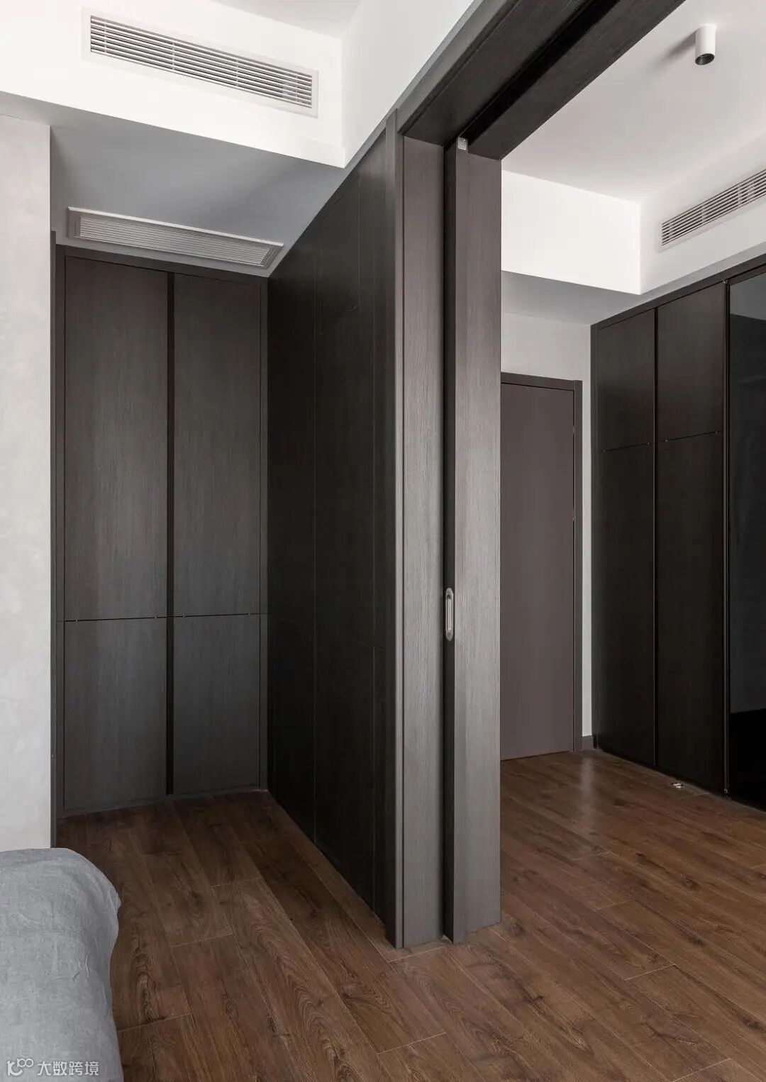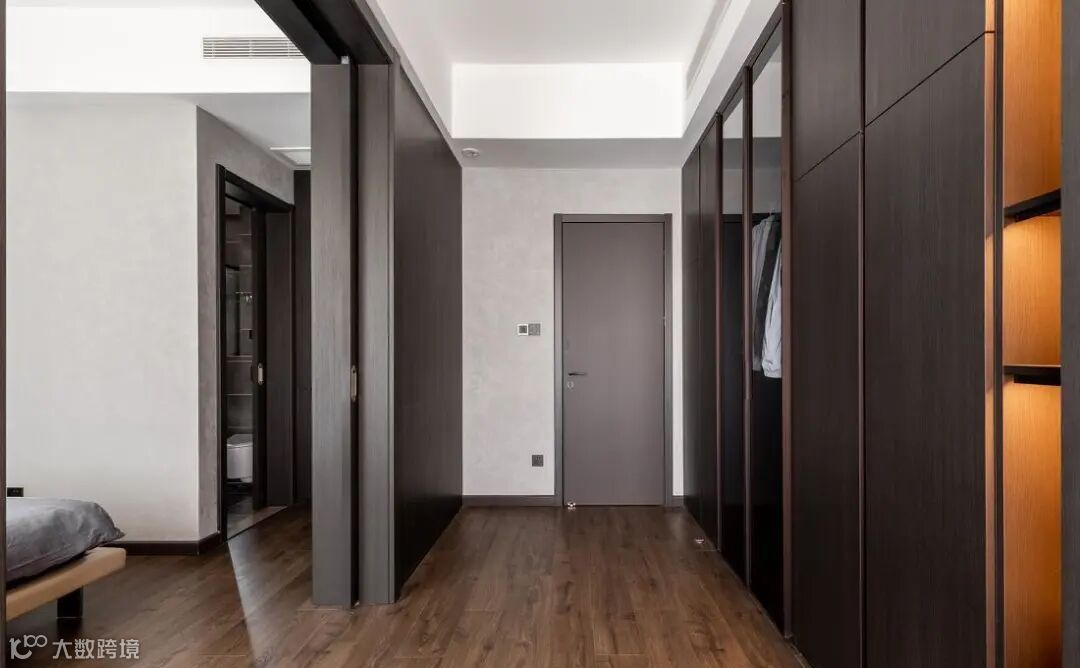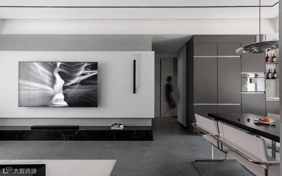 黑色木质纹理柜体,在空间中抒写肌理与质感。胡桃木色地板则中和了黑白灰的静谧,为空间增添一丝暖意。