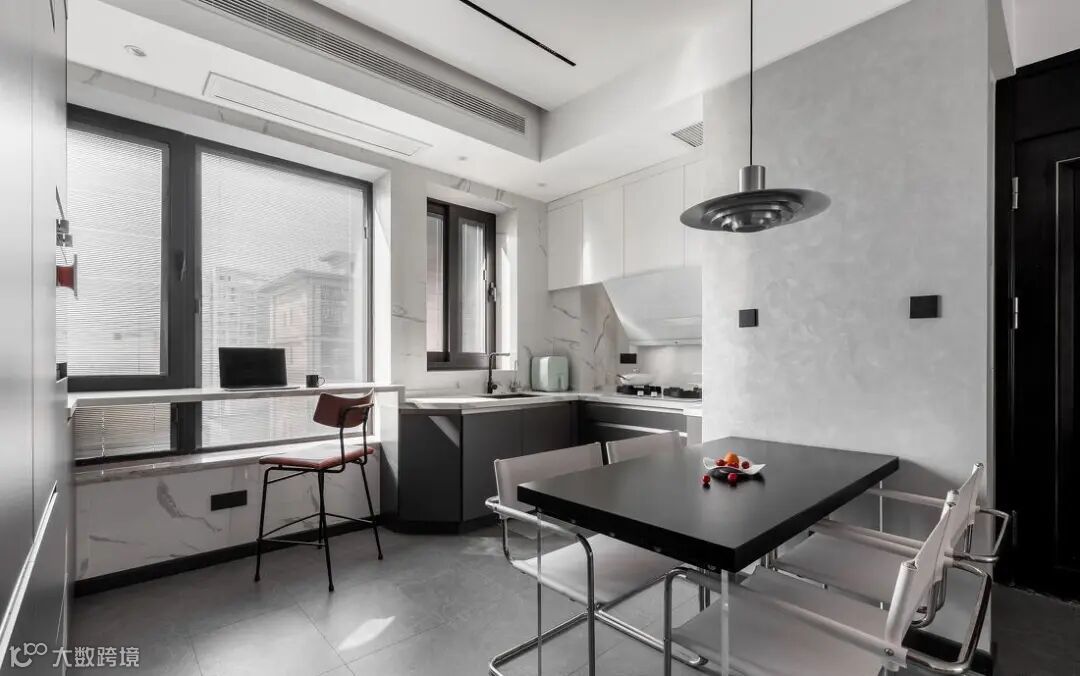 四人位餐桌靠墙摆放,节省空间让过道不会显得拥挤。有好友相聚的场景下,将其挪出便可容纳多数人就餐。