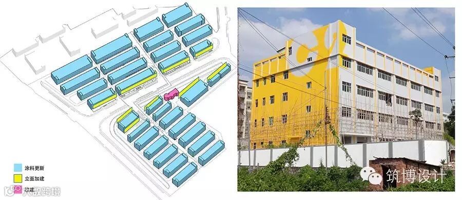 建筑形象改造本着经济节约的前提,城市设计将立面改造划分为两个层级,以城市主干道华粤东路两侧的建筑为第一层级,其余为第二层级。第一层级的建筑立面改造,联合首层商业的置入进行适度的加建;第二层级的立面改造以涂料为主要手段。