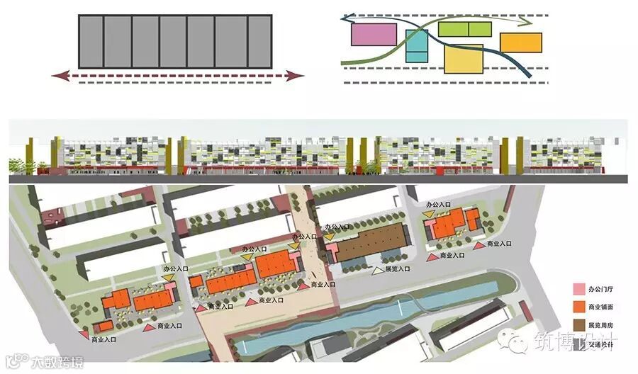 沿街首层商业由原来的并排式改为引入式商业模式,直接增加铺面的临街利用率,增加商业租值,促进人流向园区渗透增加园区活力。而耐候钢雨棚的设置则视觉上加强了商业街的连贯性,具有相当的昭示性与雕塑感。