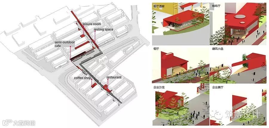 厂房建筑修建于90年代初,虽尚能很好地作为轻工业的生产场所,却尚未能满足“孵化器”的诉求。针对未来入驻人群的特性与需求,以环境营造和配套商业激活为最主要切入点,辅以建筑立面更新。这一切归咎于极少的资金投入及极短的建造周期的制约。