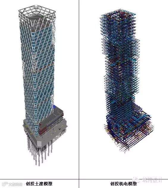创投项目 BIM 咨询工作于2013年4月启动,筑博设计 BIM 团队首先基于创投项目特征建立了创投项目 BIM 标准,然后将整栋项目信息搭建并基本深化完成;依据本项目各专业、各参建方的不同需求,提供涵盖整栋建筑设计模型、管线综合施工模型、屋面钢构方案对比模型、制冷机房整改模型,双曲弯扭菱形玻璃加工模拟模型、大堂精装模型等服务。通过对模型信息的有效管理,将模型信息进而有效的利用,为本项目在提高工作效率、控制项目成本以及提高项目的实施质量上做出坚实的基础筑博设计 BIM 咨询在为业主制定 BIM 标准、规划、管理、模型数据准确、安全的同时,也为项目本身创造了更大的价值。