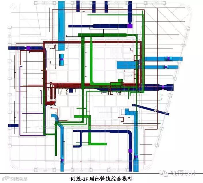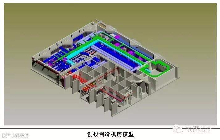 在管线综合具体工作中值得一提的就是制冷机房的优化工作,原有的设计图纸存在以下问题:设计净高不足、分集水器与系统管道的连接有误、设备基础的布置有误、维护通道不足、主机管道布置未考虑设备本身的特征导致冷却、冷冻管道无法安装、检修空间不足,设计定位标注及大样图均存在较大偏差、各个专业图纸吻合度差等问题,导致创投项目的制冷机房十分狭小,在不影响建筑功能的条件下,外移建筑墙体400mm以增加检修空间,机电管线在走向,管线次序、设备位置、水泵位置均做了较大调整,由于机房净高过低,所有主机均按照施工方拟采购的设备进行校核,筑博设计 BIM 咨询提供了2种 BIM 模型方案供各方选择,经过多次 BIM 专题会将机房 BIM 模型修正方案最终确定; BIM 团队介入项目的时间正好为机房预留预埋的施工工作,我们在第一时间发现了问题并做及时反馈,及时让施工停止前期基础预埋工作,改为机房深化方案确定后采用后期浇筑的方式,避免了由于设计原因造成的施工现场二次返工,制冷机房深化模型最终经过各方审核以后出具制冷机房三维平面图,轴侧、剖面图纸,有力的保证了项目顺利实施的各阶段工作顺利开展。