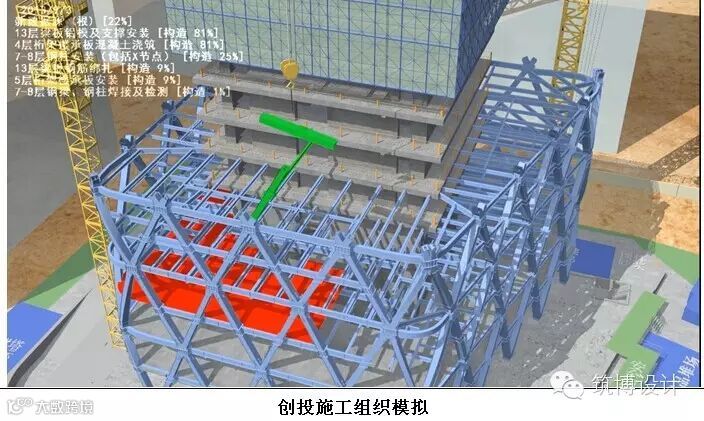 施工组织是对施工活动实行科学管理的重要手段,它决定了各阶段的施工准备工作内容,协调了施工过程中各施工单位、各施工工种、各项资源之间的相互关系。通过 BIM 可以对项目的重点或难点部分进行可行性模拟,按月、日、时进行施工安装方案的分析优化。对于一些重要的施工环节或采用新施工工艺的关键部位、施工现场平面布置等施工指导措施进行模拟和分析,以提高计划的可行性;也可以利用 BIM 技术结合施工组织计划进行预演以提高复杂建筑体系的可造性(例如:施工模板、玻璃装配、锚固等)。借助BIM 对施工组织的模拟,项目管理方能够非常直观地了解整个施工安装环节的时间节点和安装工序,并清晰把握在安装过程中的难点和要点,施工方也可以进一步对原有安装方案进行优化和改善,以提高施工效率和施工方案的安全性。项目 BIM 团队按照施工方的安装顺序将核心筒结构施工、外框筒钢结构施工、组合楼板施工、混泥土结构施工的先后节点以及复杂的钢结构安装节点进行模拟,来直接进行对施工班主的工序交底工作。