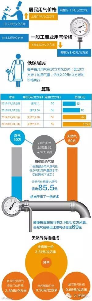 据昆明市发展与改革委员会消息,8月1日起,昆明市管道天然气价格将执行全省统一的临时销售价格政策,居民用气价格调整为3.31元/立方米,与目前昆明市执行的价格相比每立方米将上涨0.33元;一般工商业用气价格调整为3.42元/立方米,每立方米下降1.40元;低保户用气量在10立方米内的依然可享受优惠政策。