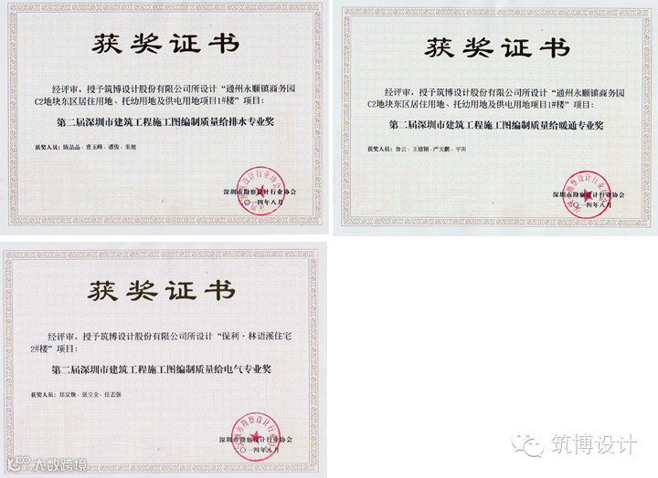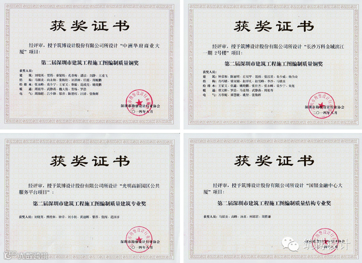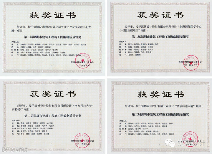 在深圳市勘察设计行业协会2014年7月举办的“第二届深圳市房屋建筑工程优秀施工图设计”评选活动中,筑博设计参评项目在公建类和住宅类评选中各有5个申报项目获得奖项,公建类获得项目奖2银3铜及4项专业奖;住宅类获得项目奖1金2银2铜及5项专业奖。具体奖项如下: