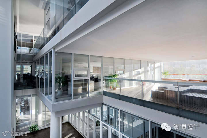以谦逊的姿态在场地中留出开放的公共景观通道,开敞的空间结合室内厅堂,既达到了丰富空间类型、提升空间价值的目的,又节约了建筑整体能耗,取得绝佳的窗景效果。室外公共景观与室内微环境景观相互穿插,形成了丰富的空间过度,充分利用了灰空间,进一步丰富了建筑的空间语汇。