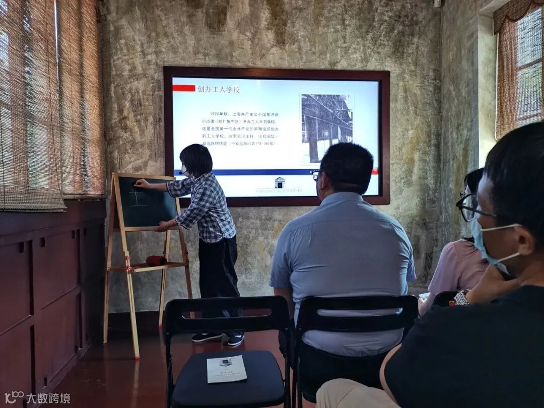 全体参加党员在馆内体验了一堂名为《足迹:红色序曲》的精彩情景党课。讲解员化身为工运先驱李启汉的妹妹,讲述李启汉在革命斗争形势复杂的大城市上海开办工人学校、组织工人运动、创办进步刊物的故事。