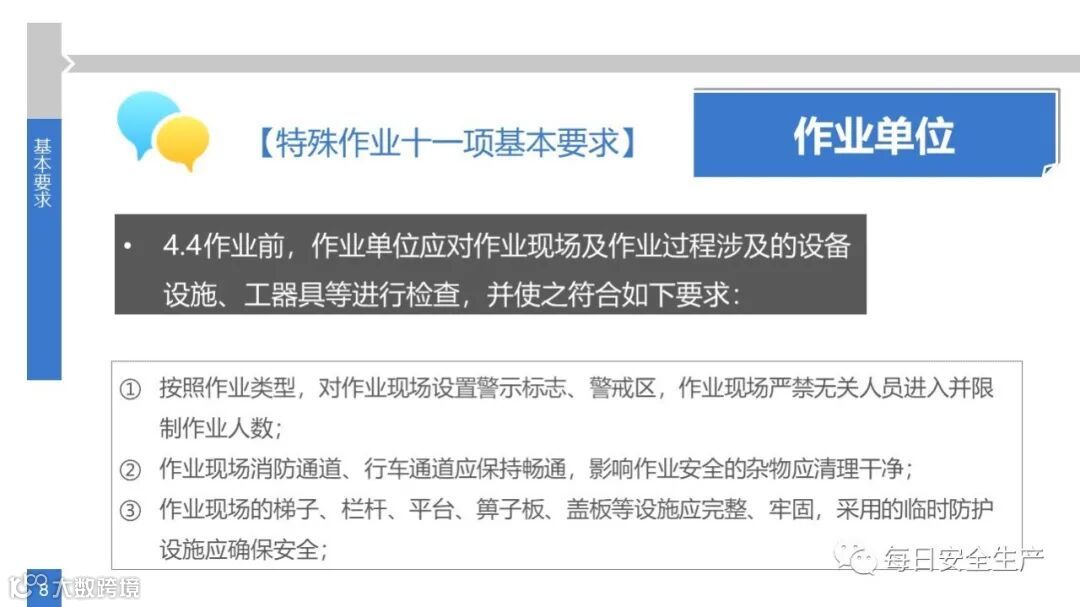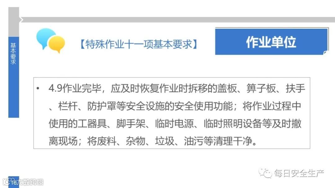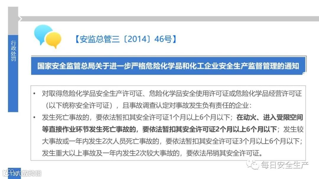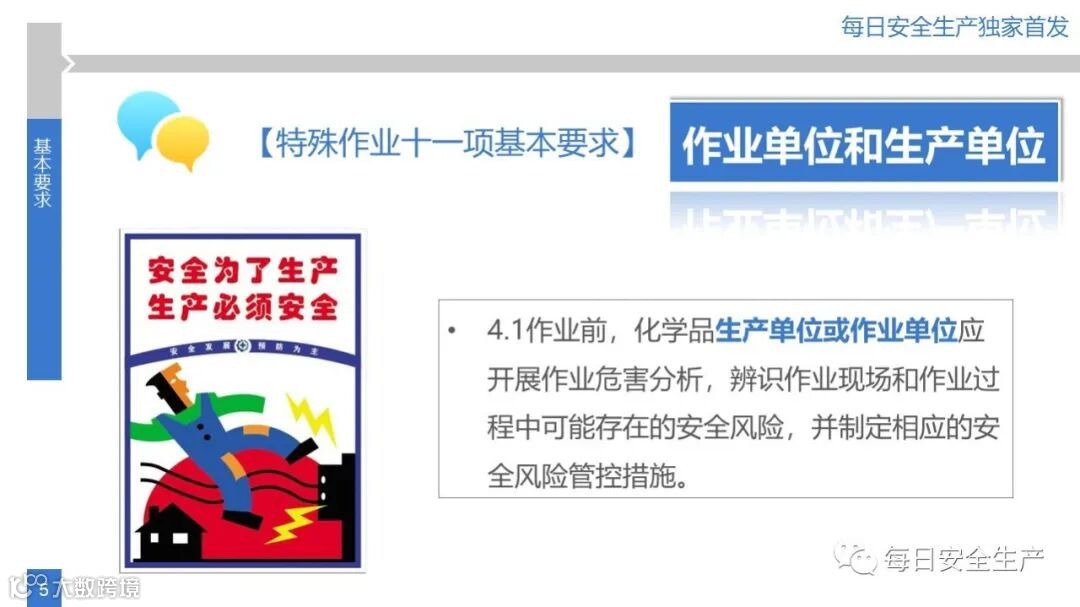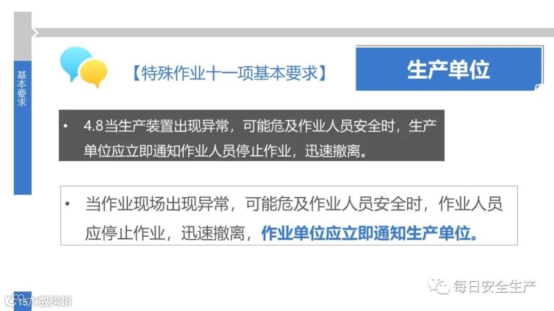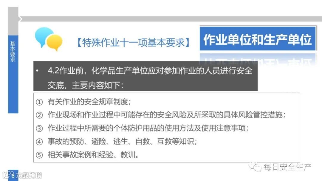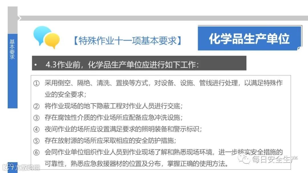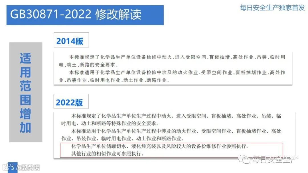 ——由原来仅适用于化学品生产单位设备检修中动火、进入受限空间、盲板抽堵、高处作业、吊装、临时用电、动土、断路的安全要求。扩大到化学品生产单位生产过程中。