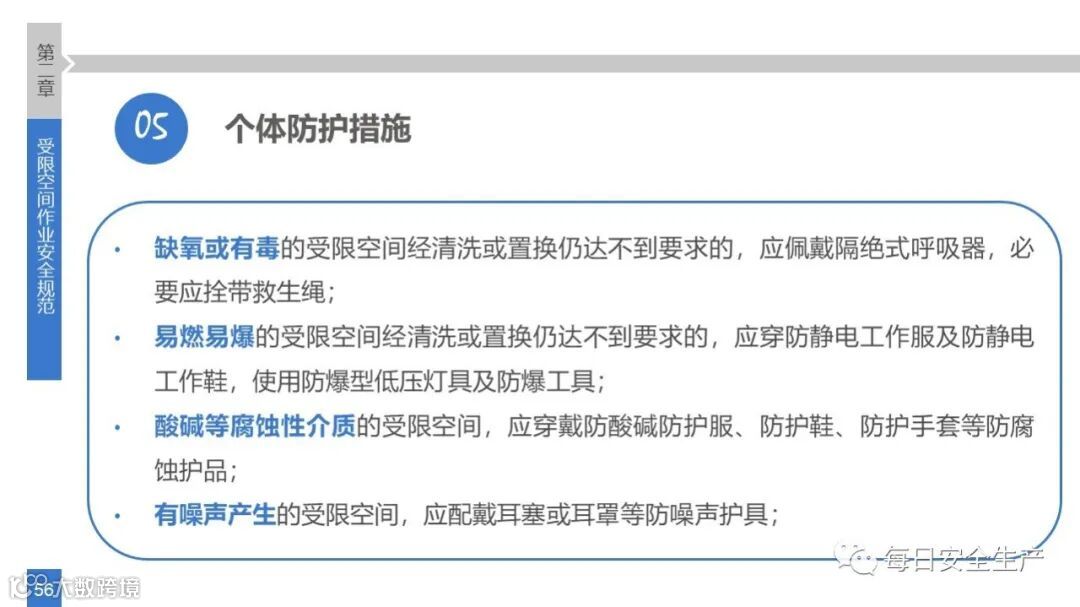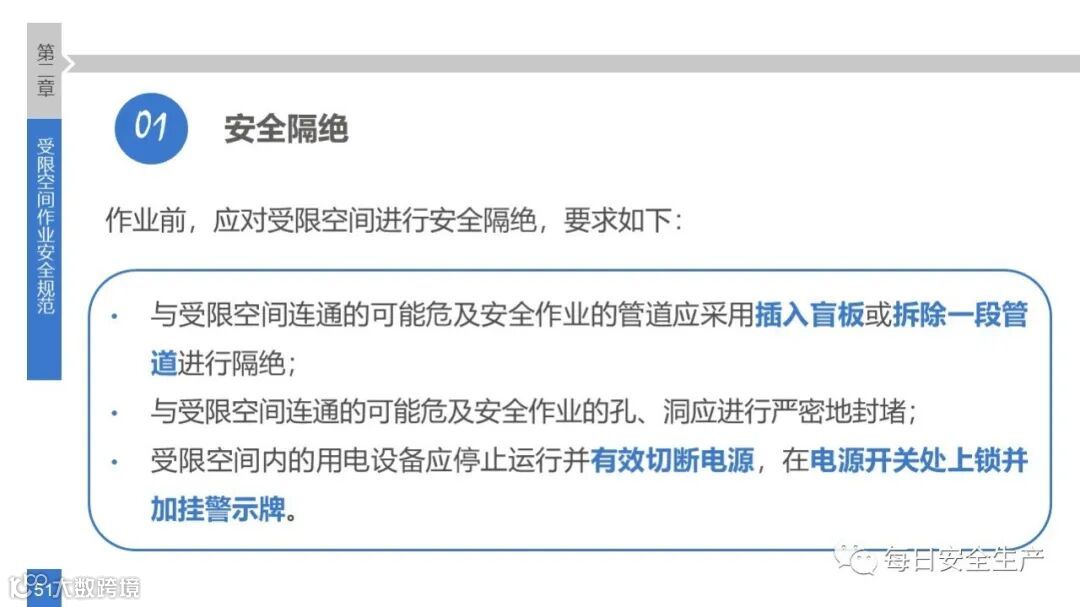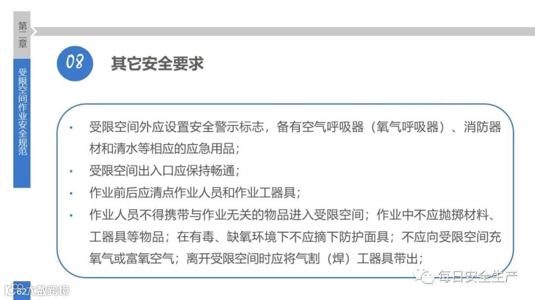 ——进入受限空间作业方面,强化风险管控,例如介质隔离时,不得用阀门代替盲板。进一步强调了进入受限空间内作业前必须分析的气体类别及浓度要求,确定最低氧含量由原来的18%提高到19.5%;进入受限空间作业需连续检测气体浓度等具体要求。