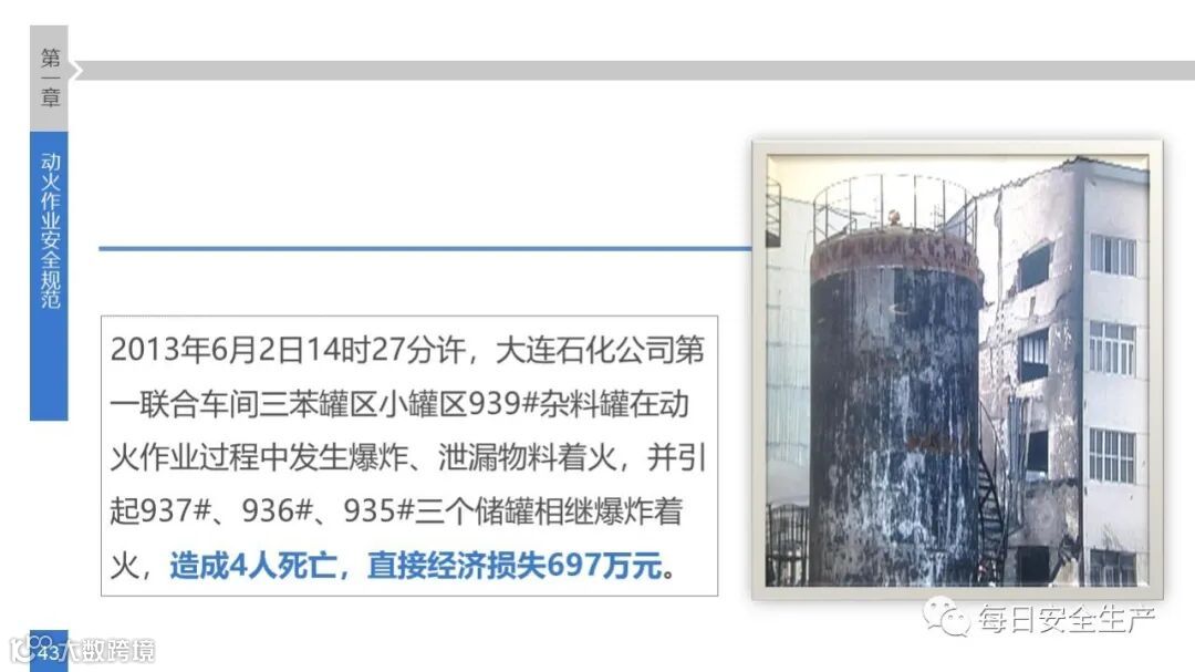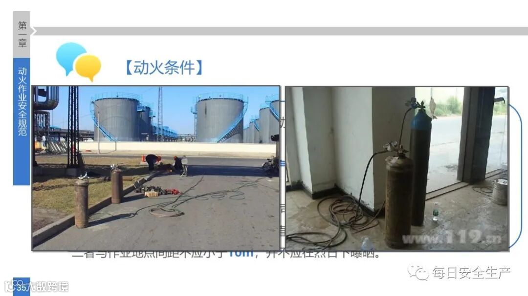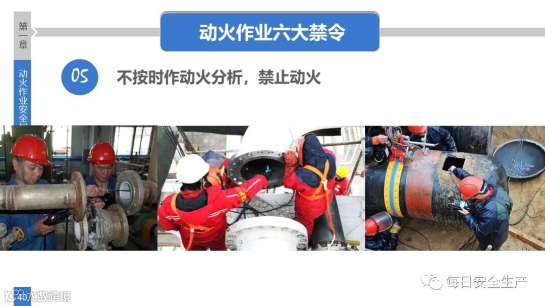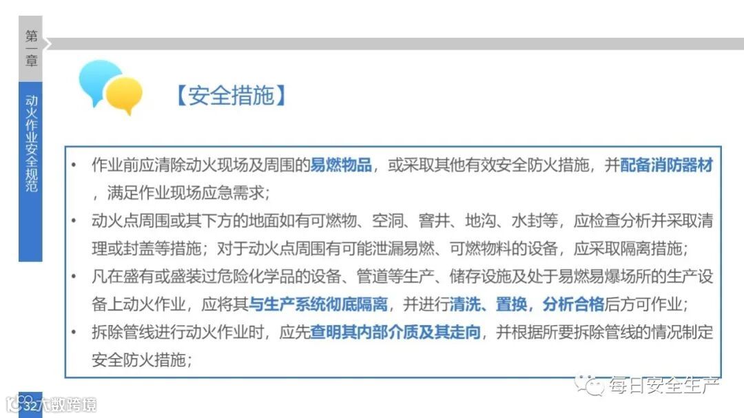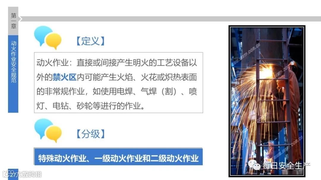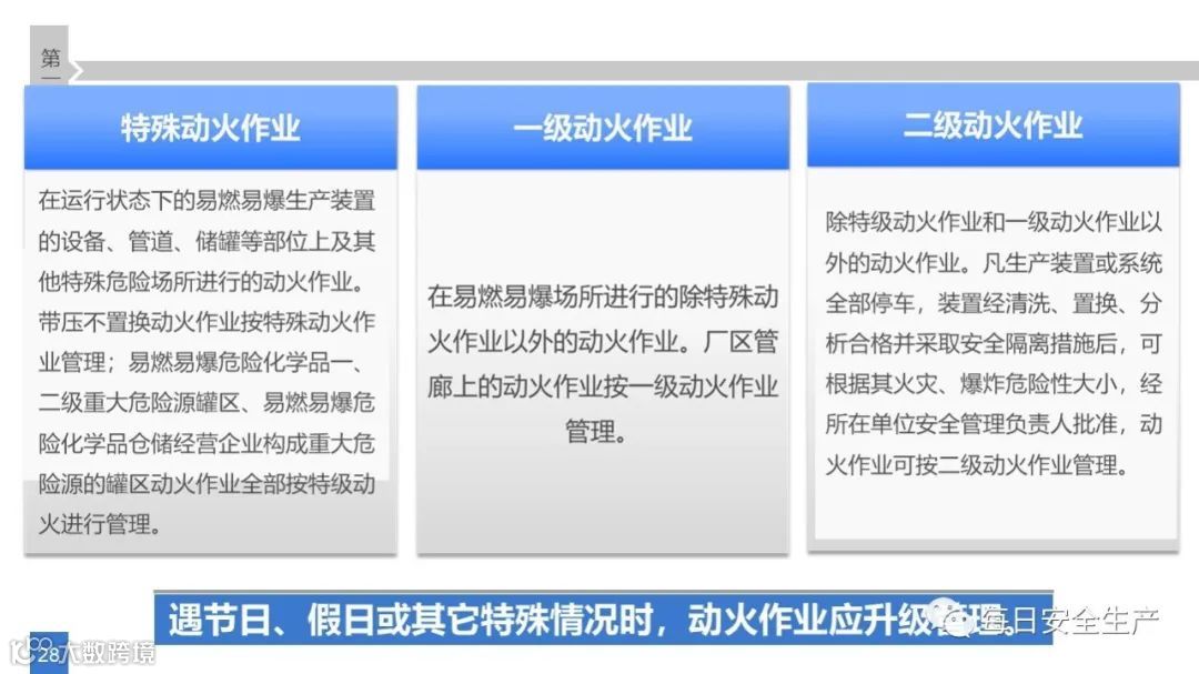 ——动火作业方面,扩大了特级动火划分范围,将在运行状态下的火灾爆炸危险场所生产装置设备、管道、 储罐、容器等部位上进行的动火作业(包括带压不置换动火作业)和运行中的重大危险源罐区防火堤内动火作业,划为特级动火。