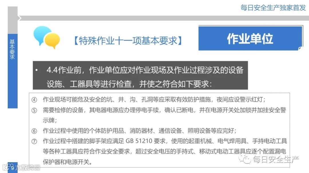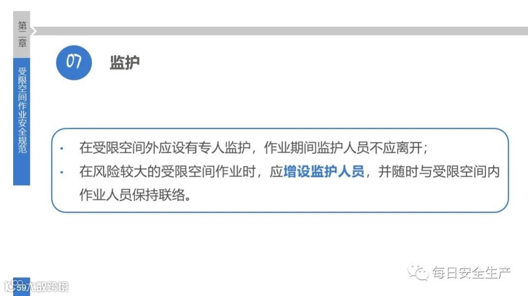 ——进一步明确了作业监护人的要求。例如,作业期间,企业和作业单位均应设监护人,监护人应由具有生产/作业实践经验的人员担任,监护人经专项培训考试合格;作业期间,监护人不得擅自离开且不得从事与监护无关的事;确需离开作业现场时,应收回作业票(证),暂停作业;受限空间作业监护人的要求监护人员须在受限空间外进行监护,严禁在无任何防护措施的情况下探入受限空间监护人应对进入受限空间的人员及其携带的工器具种类、数量进行登记等要求。