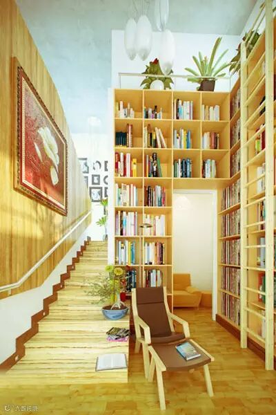 搭配方案:书架的材质和地板相一致,很好的融为一体,尽头处还有梯子可供高处书籍的拿取。