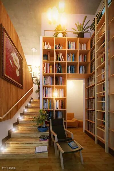搭配方案:楼梯上安装了灯泡,所以在晚上一样可以有很不错的阅读角。向里走就是休息空间。两边的书籍也是很好的装饰。