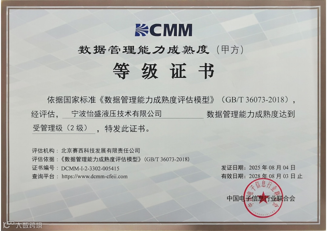 对于深耕液压行业的怡盛液压而言,这份证书不仅是对公司数据管理工作的 “成绩单”,更是我们面向客户、面向行业的 “定心丸”—— 它证明怡盛液压已具备系统化管理数据资产、用数据解决业务痛点的能力,能为客户提供更可靠、更高效、更具定制化的液压产品与服务。