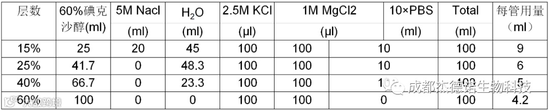 2、纯化灌柱子时,在加60%层碘克沙醇时可迅速加入,只吸4.2 ml即可,在加入其它层时,移液管中吸取的液体要比要求加入的液体体积多1 ml,防止将后一点液体加至离心管中时将下层冲散。灌注时将管子倾斜,但是不要让下层的液体倾斜至管口下缘顶,要有一小段距离,否则容易串层。