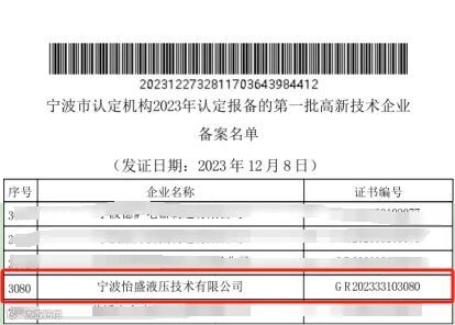 2023年12月27日,全国高新技术企业认定管理工作领导小组办公室,根据《高新技术企业认定管理办法》(国科发火〔2016〕32号)和《高新技术企业认定管理工作指引》(国科发火〔2016〕195号)有关规定,对宁波市认定机构2023年认定报备的第一批3281家高新技术企业备案名单予以公告,宁波怡盛液压技术有限公司名列其中。