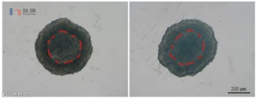 HonrayMed™ 超低吸附3D细胞培养产品内培养的3D 肿瘤细胞球,细胞和细胞间紧密连接,阻止氧气由外部进入细胞间隙 ,导致细胞球核心部分细胞处于低氧状态,模仿体内实质性肿瘤缺氧微环境。