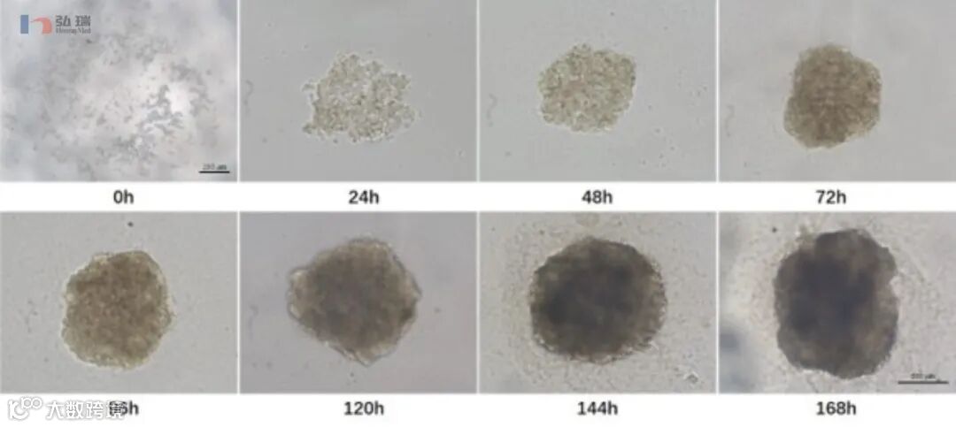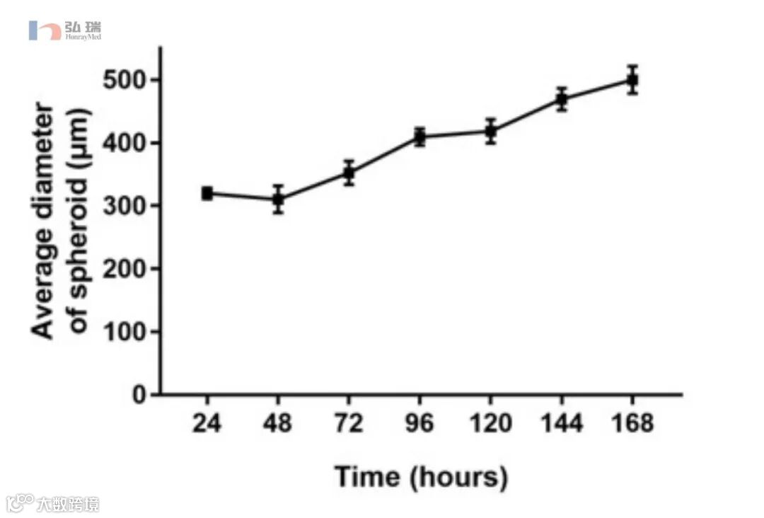 HonrayMed™ 超低吸附3D细胞培养表面可通过控制接种细胞数目来控制3D细胞球状体形成尺寸,随着时间的推移,球体的体积会逐渐增加。