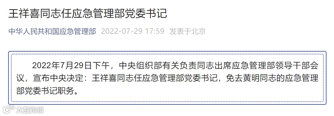 2022年7月29日——,应急管理部党委书记。