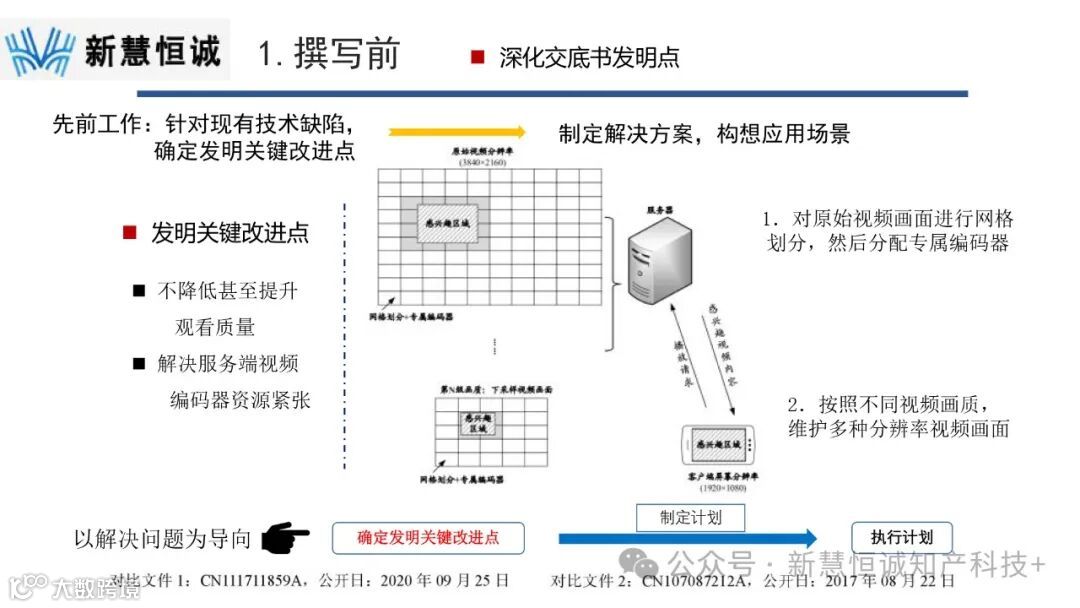 在明确了现有技术的缺陷后,代理师进一步深化了交底书中的发明点,制定了具体的解决方案,并构想了应用场景。例如,通过网格划分和专属编码器的分配,可以有效减轻服务端的硬件压力。