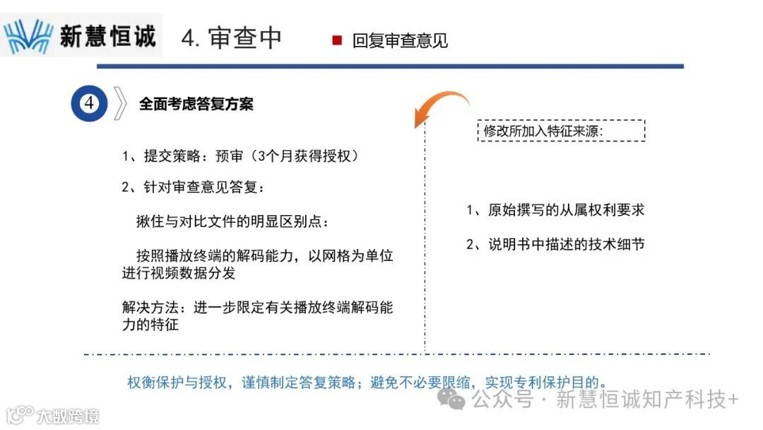 在审查过程中,代理师需要权衡保护范围与授权可能性,谨慎制定答复策略。例如,针对审查意见,代理师进一步限定了有关播放终端解码能力的特征,确保专利的创新性得到充分保护。