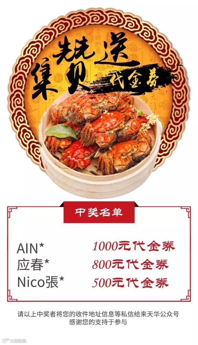导读:来天华微信留言互动活动大蟹礼中奖名单新鲜出炉啦!各位中奖的大大收件地址信息麻利儿的发给小来代金券已经急不可耐