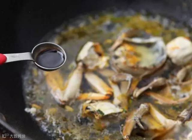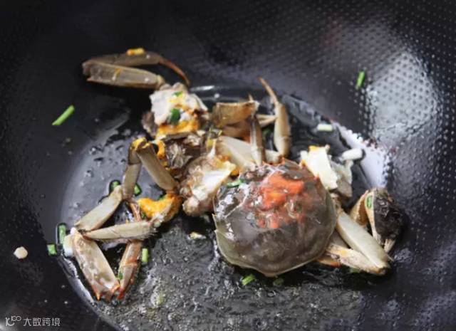 倒入螃蟹块,轻轻翻炒数下。