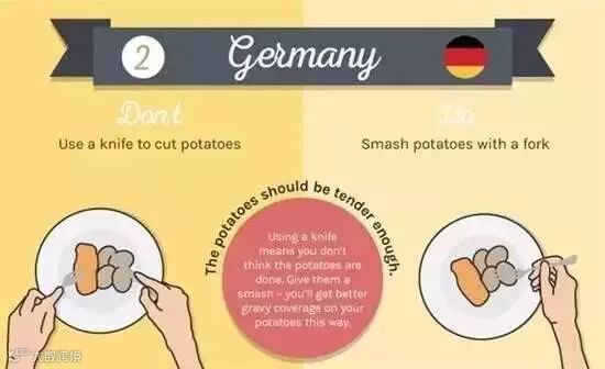 不要用刀切土豆,而应该直接用叉子叉着吃。如果你用刀切土豆,意味着你觉得土豆还不够熟,用叉子叉着吃你才能尝到鲜嫩多汁的土豆。